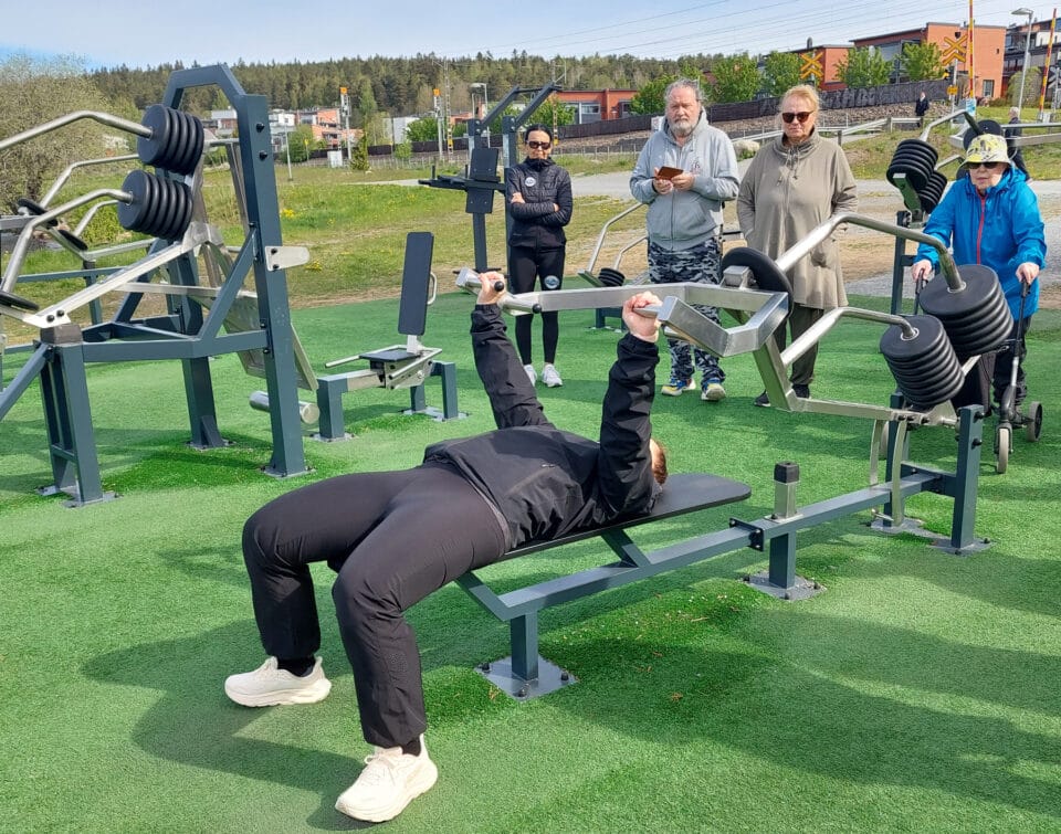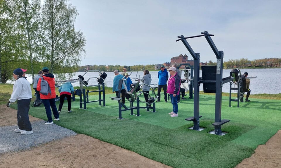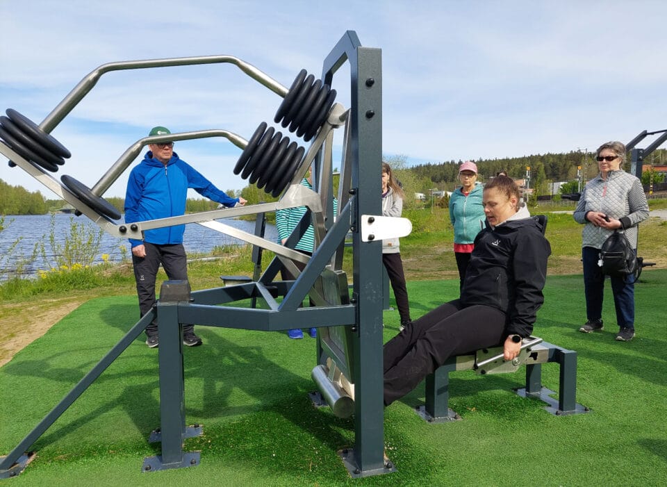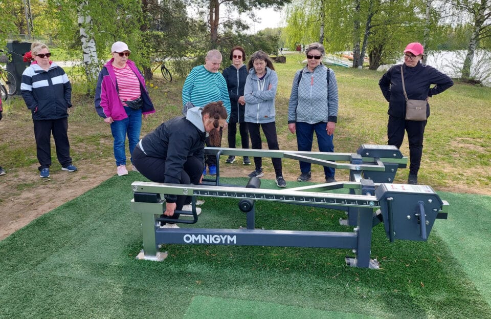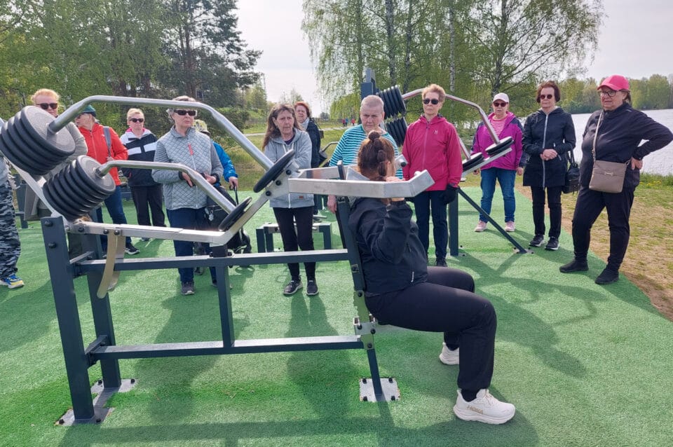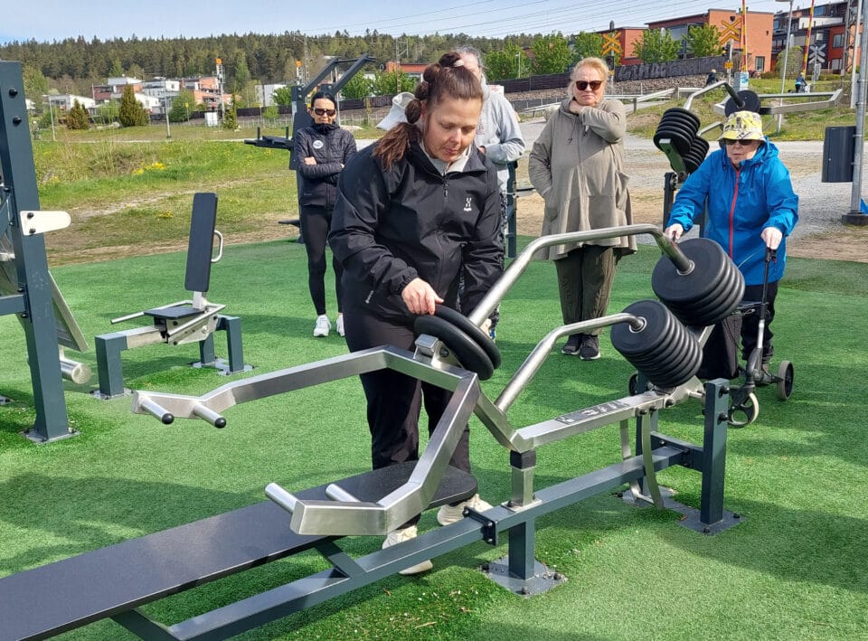 Liikunnanohjaaja Noora Jakobsen neuvoi ja ohjasi meitä ulkokuntolaitteiden oikeaoppiseen käyttöön Sairionrannassa 20.5.2025. Paikalla oli noin 20 innokasta kuntoilijaa.